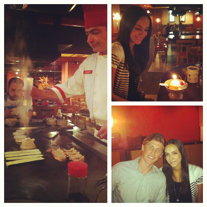 We flew home that night, after the game. Cam's sister Crystal was so sweet to pick us up. She gave me her present in the car- free tickets to the Ghost Tours in San Diego! I can't wait to go! I love freaky stuff! I came home to find a present for me on the bed- the yellow shoes I've been wanting so much! We then conked out. The next day, Cam told me that he was taking me out for my Birthday dinner that night, and it was a surprise where we were going. I was so excited, but for some reason I wanted to go to Beni Hana! I texted him, and said, "Hey, we should go to Beni Hana!" He promised we'd go another time, but he really thinks I'll like the place he has reservations at. As we pull up to the restaurant, it's Beni Hana! HA! He had planned on taking me there all along. So precious. It was the best meal, with my best friend.